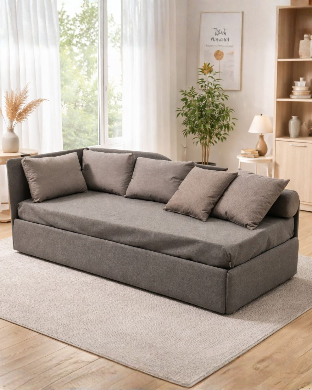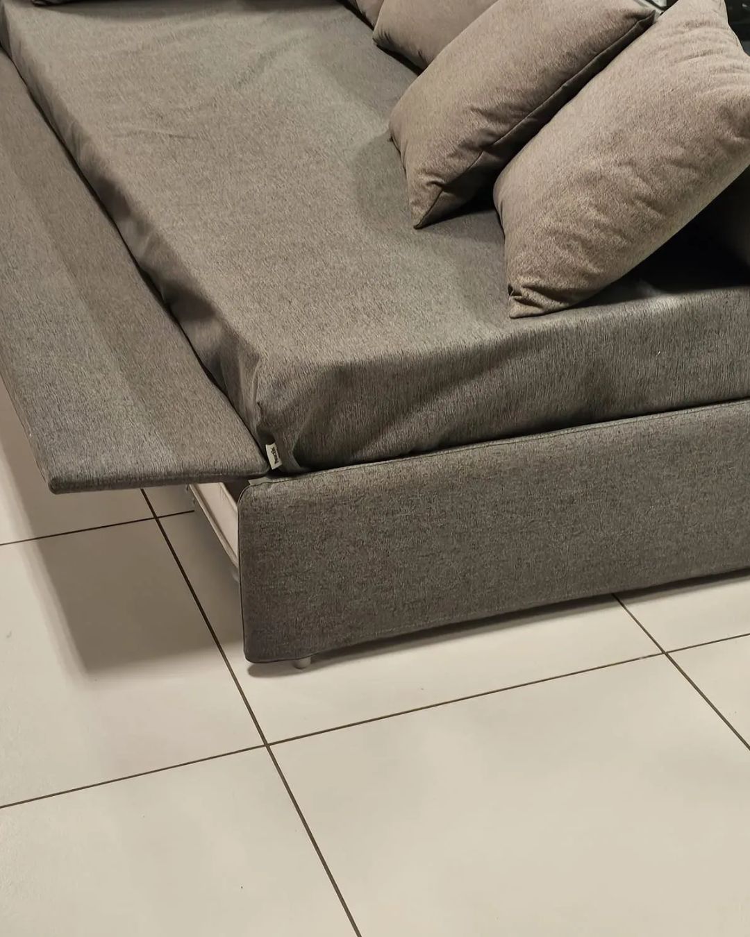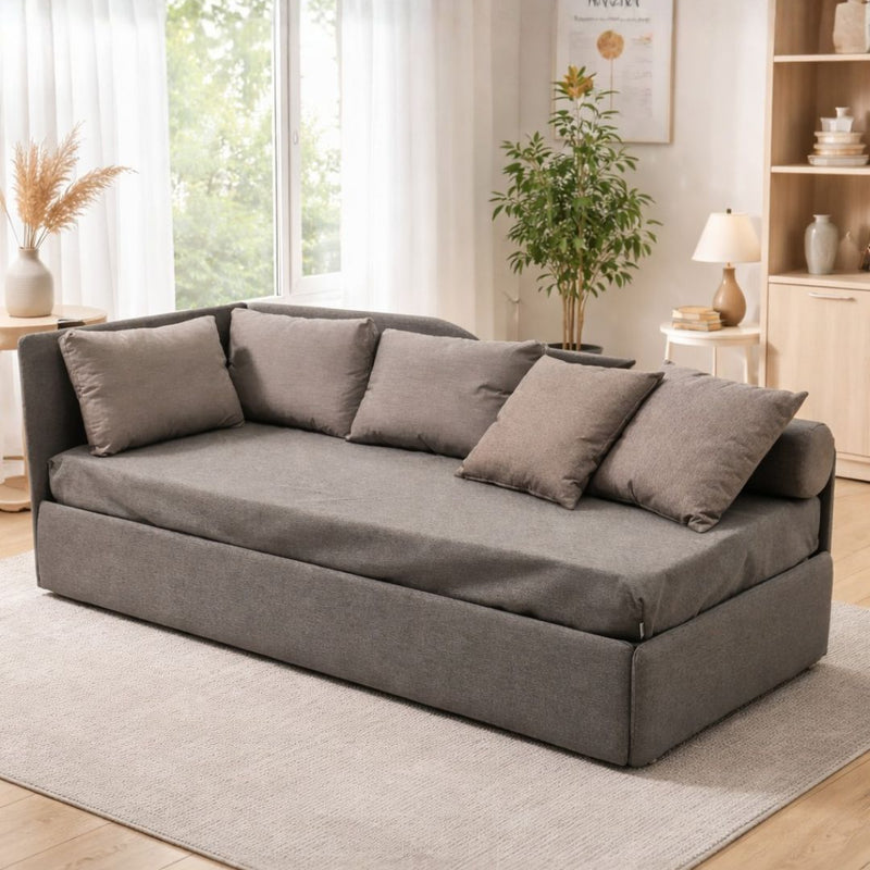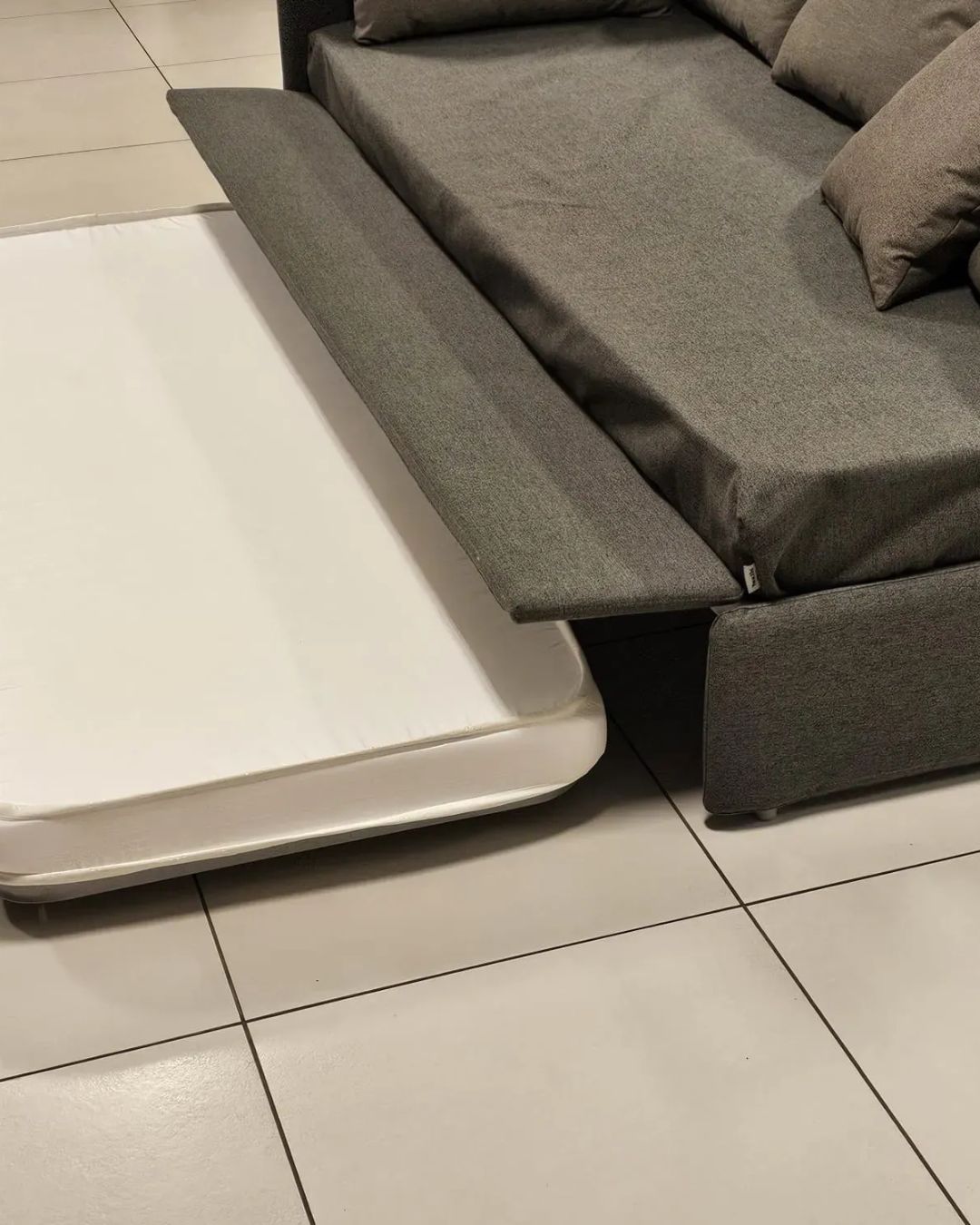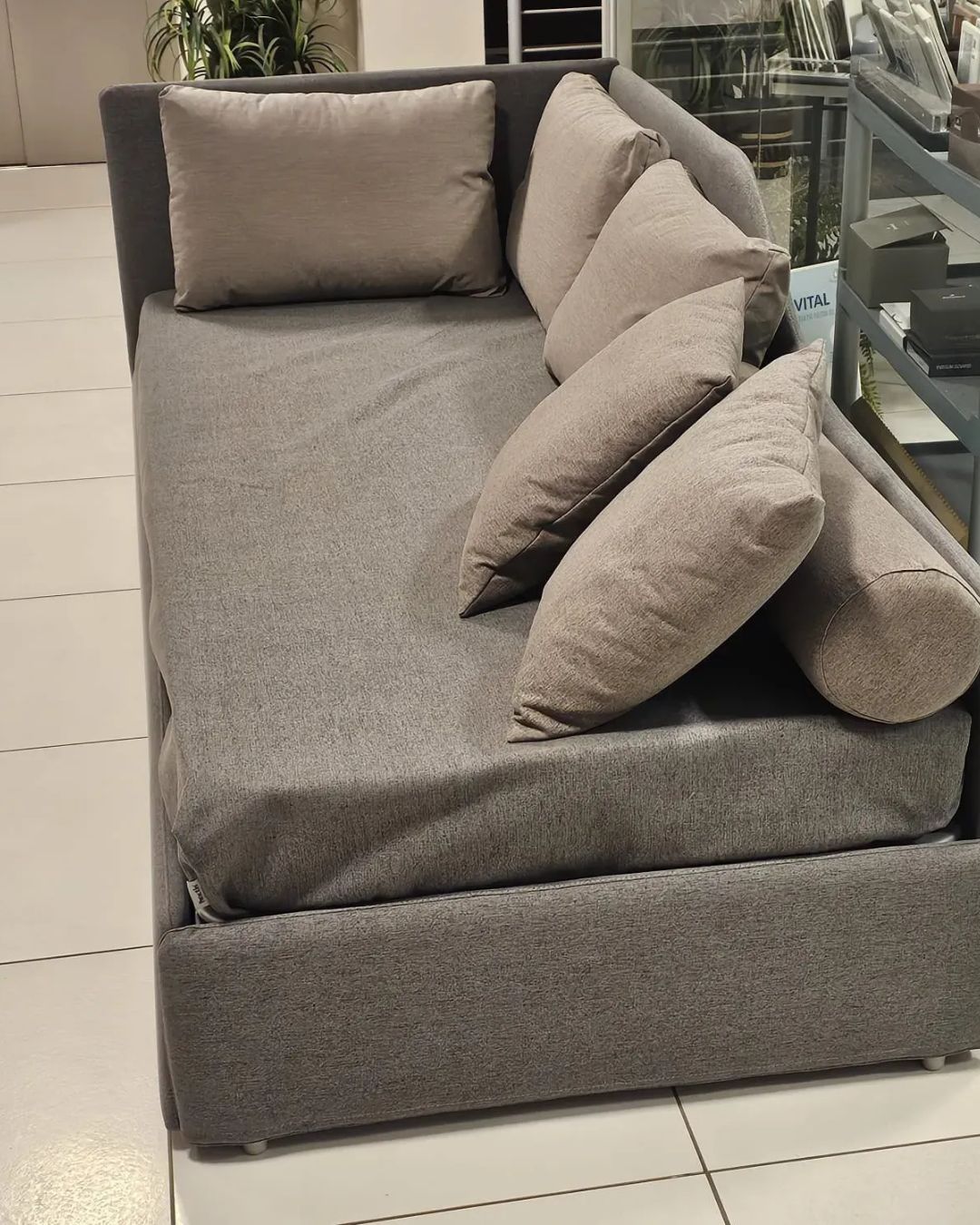 This sofa bed can be used to create two separate single beds, or as a double bed if twinned. The backrest features a corner design, contoured on the right side. The removable fabric upholstery includes a set of pillows and a side locking mechanism.